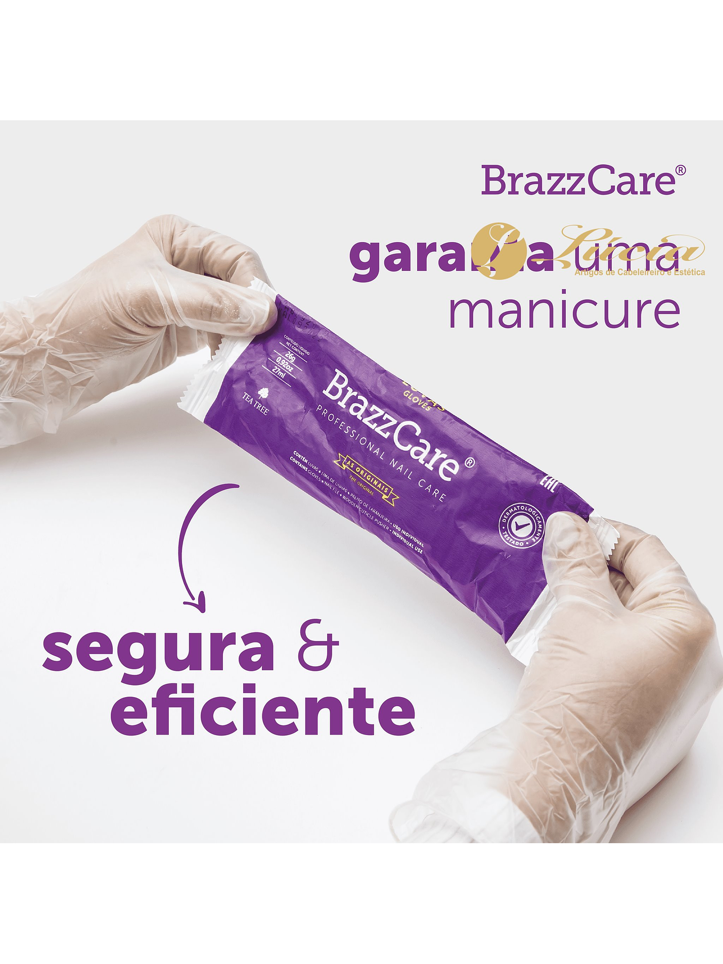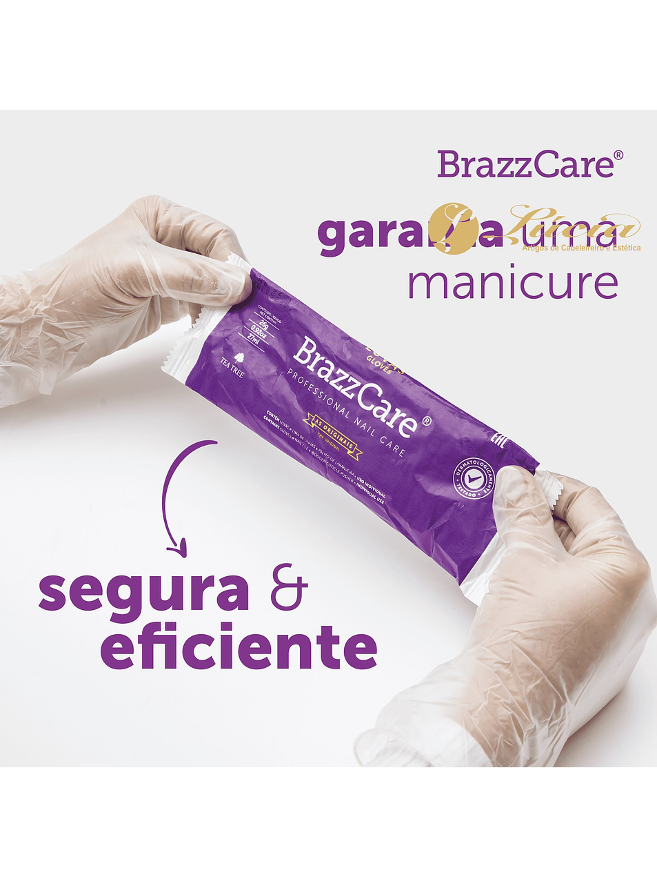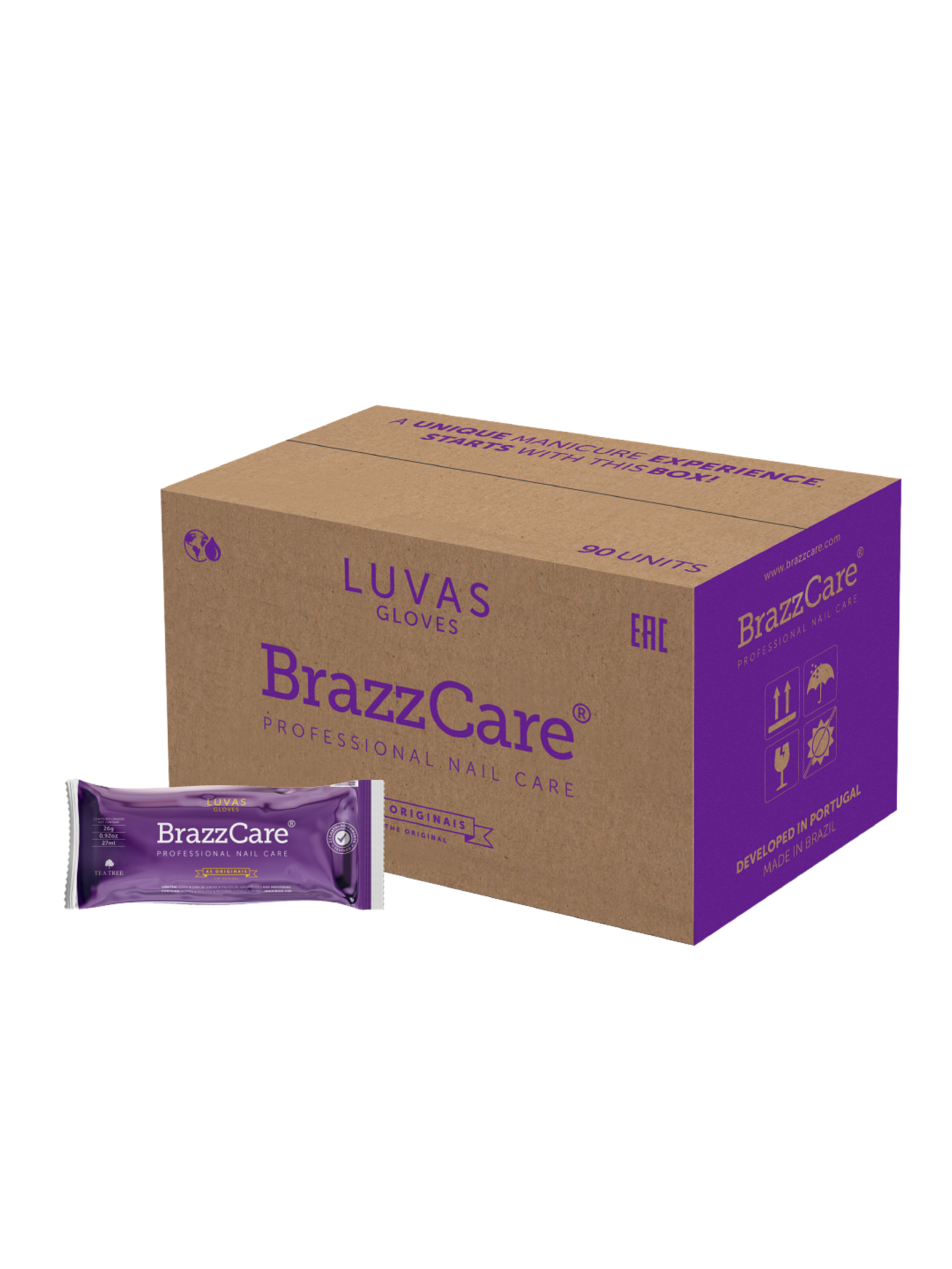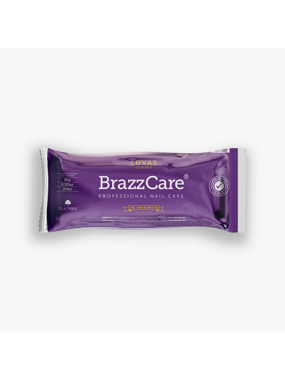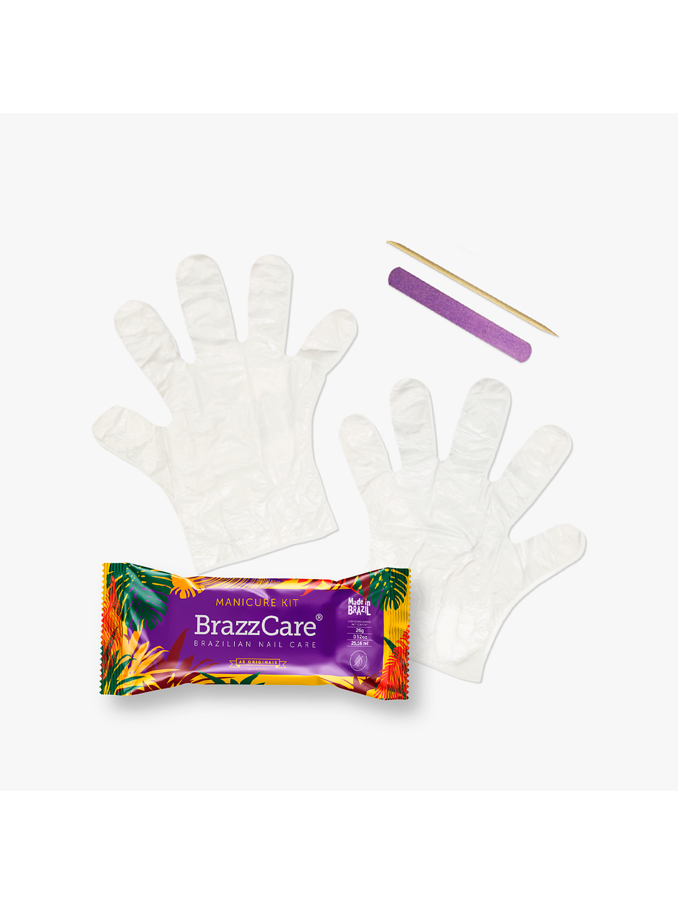 Cada Kit BrazzCare Manicure são compostos por um par de luvas um palito de laranjeira para as cutículas e uma lima de unhas.