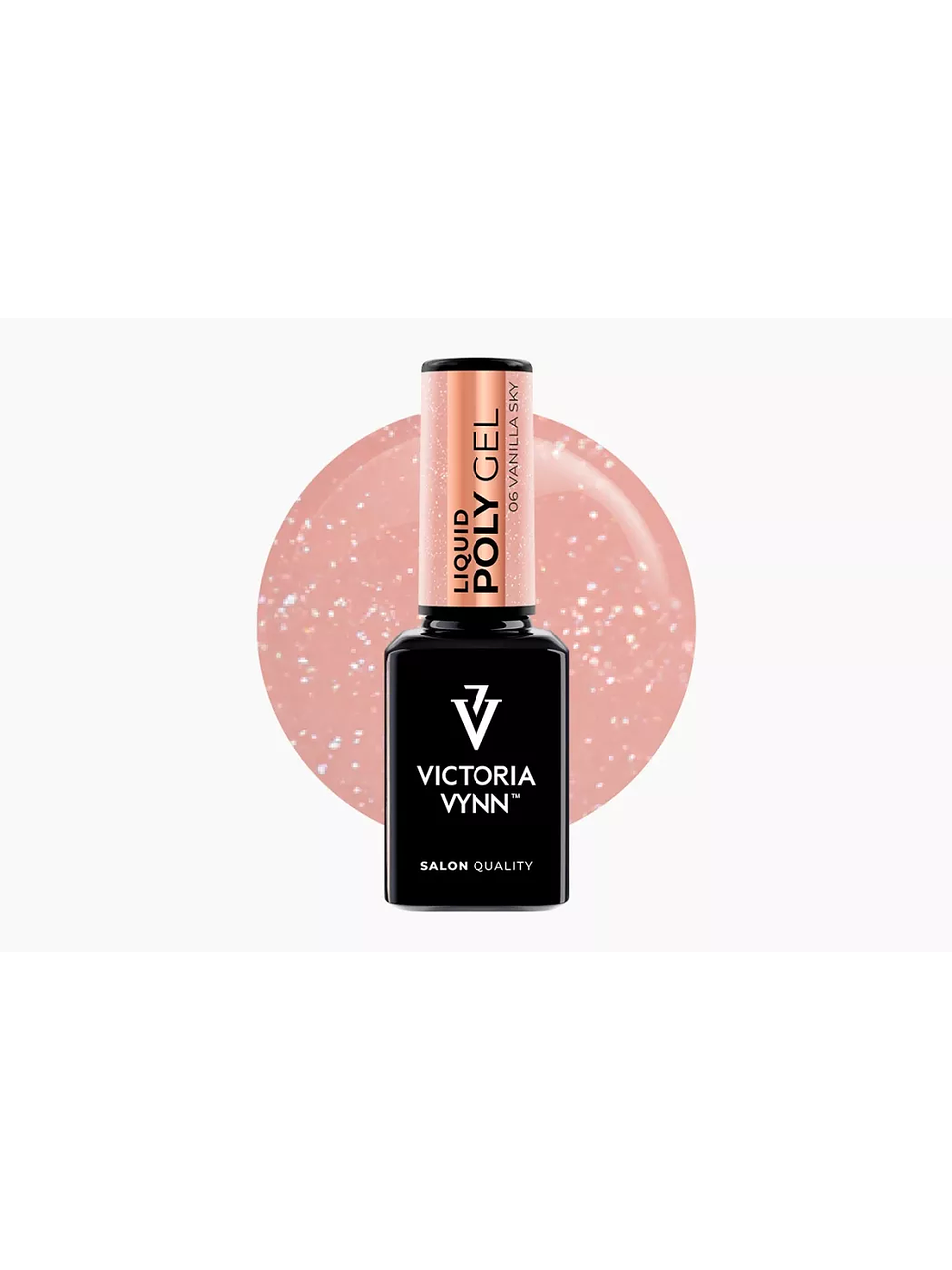 O POLY GEL LÍQUIDO 06 Vanilla Sky VICTORIA VYNN é um gel acrílico líquido em tom rosa com partículas douradas. Combina a força do acrílico com a leveza do gel. A fórmula líquida autonivelante em frasco é perfeita para sobreposições rápidas (construção), alongamento de unhas e o método "One Drop" sem lixamento.