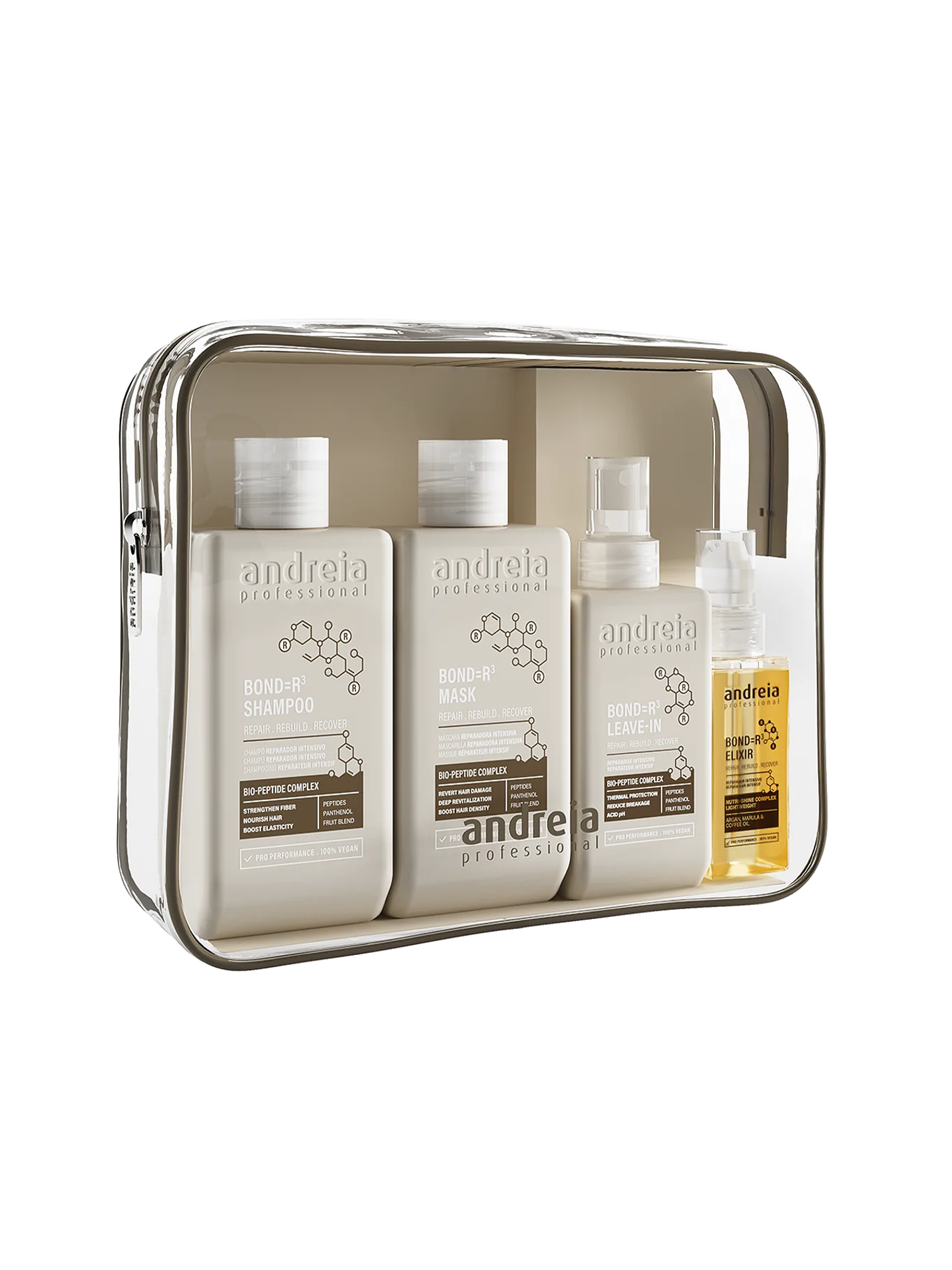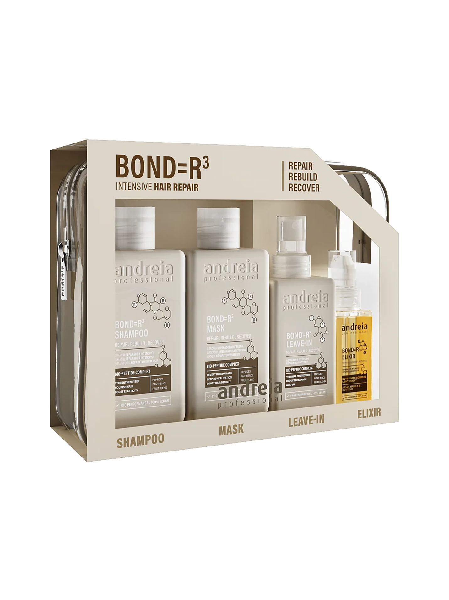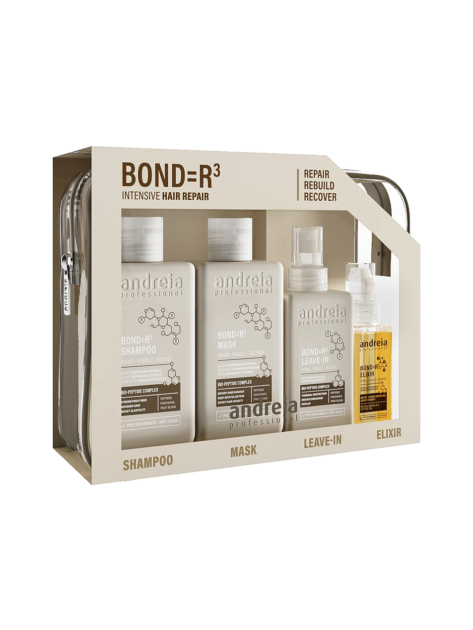 O BOND=R³ Intensive Hair Repair Set de Andreia Professional reúne quatro produtos essenciais para a reparação profunda do cabelo danificado, apresentados num nécessaire prático e elegante, perfeito para manter os produtos organizados, levar de viagem ou reutilizar.