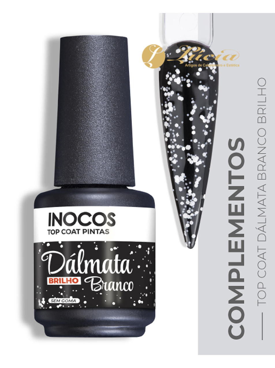 Top Coat sem goma INOCOS efeito Dálmata (efeito pintas) com acabamento Branco Brilhante. Efeito varia consoante a cor base escolhida. Produto Vegan e Cruelty Free