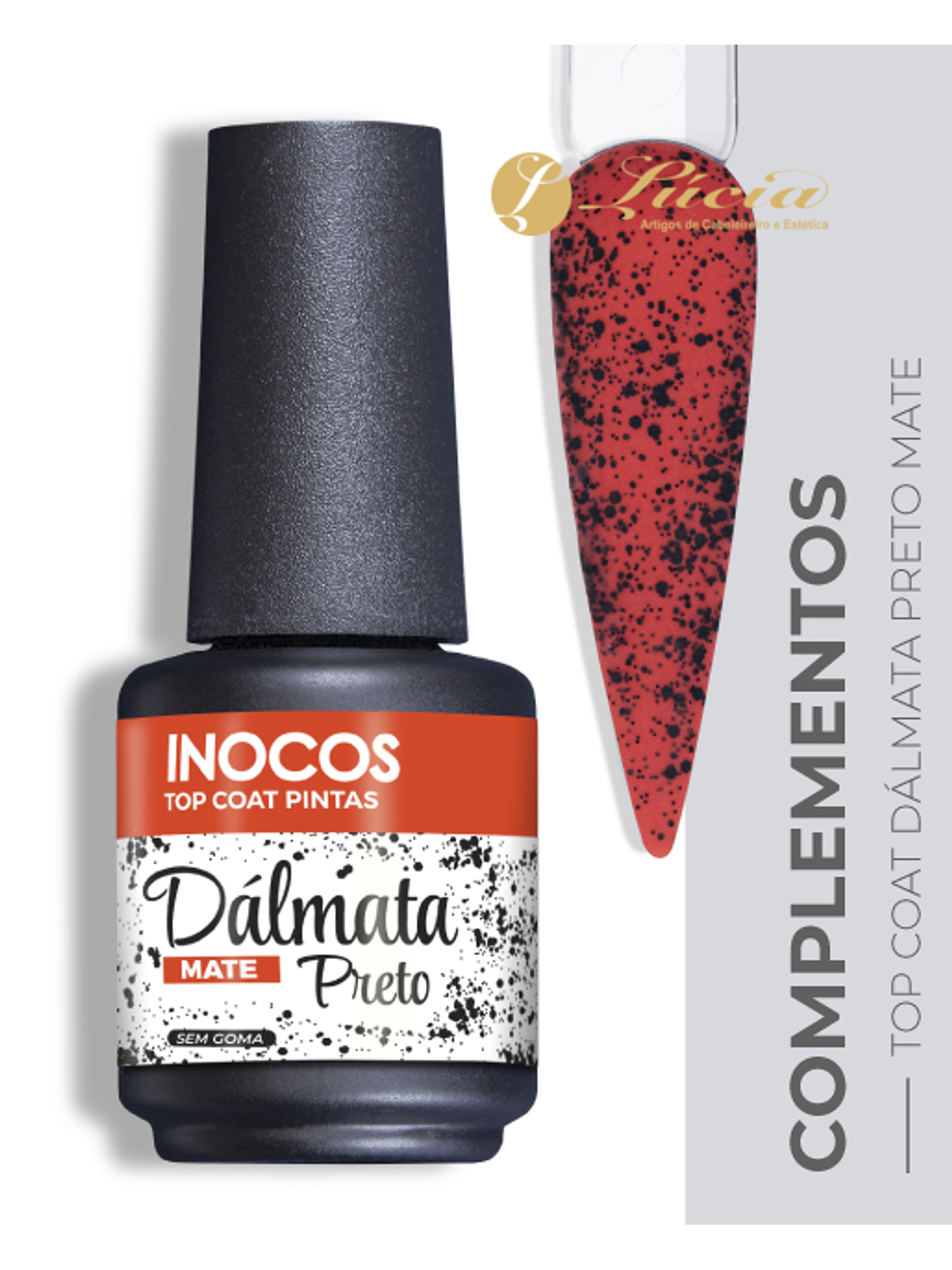 Top Coat sem goma INOCOS efeito Dálmata (efeito pintas) com acabamento Preto Mate. Efeito varia consoante a cor base escolhida. Produto Vegan e Cruelty Free
